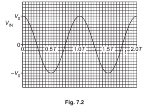 (b) V$_{IN}$ has amplitude V$_{0}$ and period T. Fig. 7.2 shows the variation with time t of V$_{IN}$.