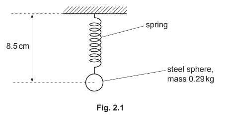 A steel sphere of mass 0.29kg is suspended in equilibrium from a vertical spring. The centre of the sphere is 8.5cm from the top of the spring, as shown in Fig. 2.1.