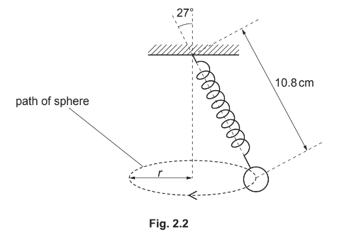 (a) Explain, with reference to the forces acting on the sphere, why the length of the spring in Fig. 2.2 is greater than in Fig. 2.1.