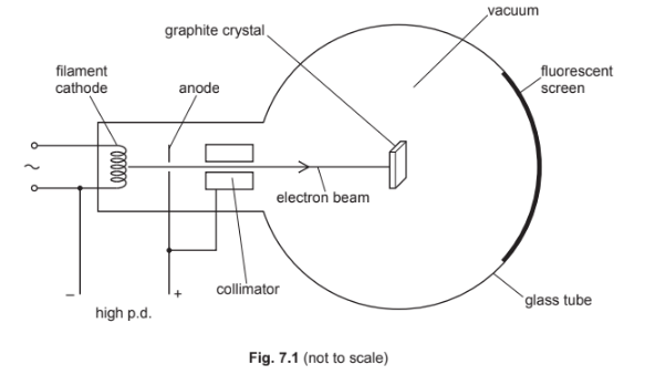 (b) Fig. 7.1 shows a glass tube in which electrons are accelerated through a high p.d. to form a beam that is incident on a thin graphite crystal.