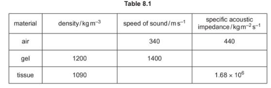 8 (a) Table 8.1 shows some data relating to the properties of air, gel and body tissue. The data are given to three significant figures.