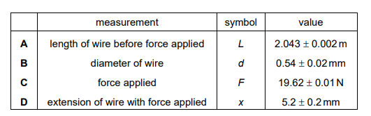 The wire is extended by a known force and the following measurements are made. Which measurement has the largest effect on the uncertainty in the value of the calculated Young
