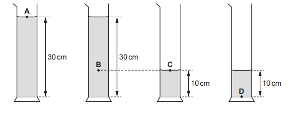 Four measuring cylinders are filled with the same liquid to the heights shown. At which position is the pressure the greatest?