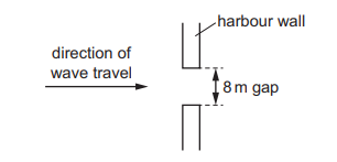 A water wave passes through a gap in a harbour wall and diffracts. The gap has a width of 8 m.