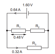 The cell has electromotive force (e.m.f.) 1.60V and negligible internal resistance. The current in the cell is 0.64A. The potential difference across R1 is 0.48V. The current in \(R_3\) is 0.32A. What is the resistance of \(R_2\)?