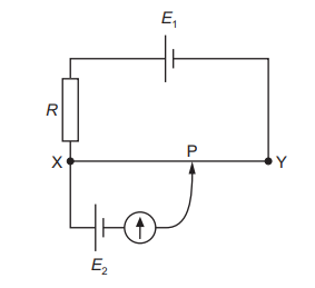 The diagram shows a potentiometer circuit used to compare the electromotive forces (e.m.f.), \(E_1\) and \(E_2\), of two cells. XY is a uniform resistance wire. The fixed resistor has resistance R. A sliding contact is moved along the wire XY. When the sliding contact is at position P, the galvanometer reads zero