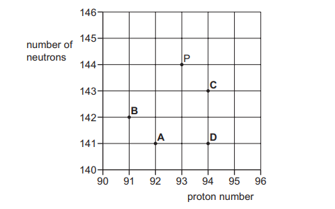 Nucleus P has 144 neutrons and 93 protons. Nucleus P is unstable and undergoes \(\alpha \)-decay to form nucleus Q. Nucleus Q then undergoes \(\beta^–\) decay to form nucleus R. Nucleus P is represented by point P on the graph. Which point on the graph represents nucleus R?