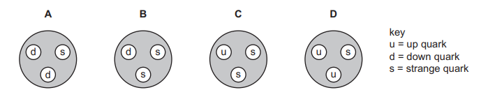 e diagrams show the quark composition of four different hadrons. One of the hadrons is a \(\sum +\) particle. It has a charge of +e, where e is the elementary charge. Which hadron could be the \(\sum +\) particle?