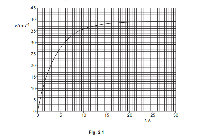 A skydiver jumps from an aircraft at time t = 0 and falls vertically downwards. The variation with t of her velocity v is shown in Fig. 2.1.