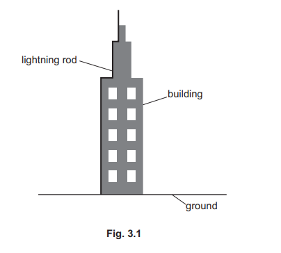 (c) A lightning rod is attached to a tall building to conduct charge safely to the ground. The lightning rod is modelled as a uniform cylindrical copper cable of total length 95m that runs from the ground to the top of the building, as shown in Fig. 3.1.