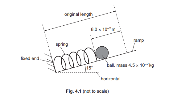 (ii) The ball leaves the spring when the spring reaches its original length. Assume that all the elastic potential energy of the spring is transferred to the ball. Calculate the speed of the ball as it leaves the spring.