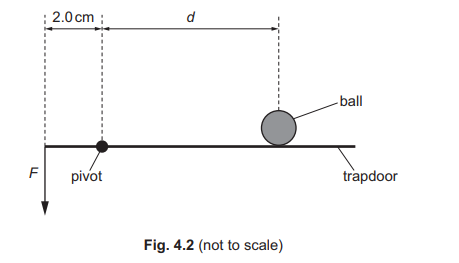 (c) The ball comes to rest on a horizontal trapdoor of negligible mass at a distance d from its pivot. A force F acts vertically downwards at a distance of 2.0cm from the pivot, as shown in Fig. 4.2