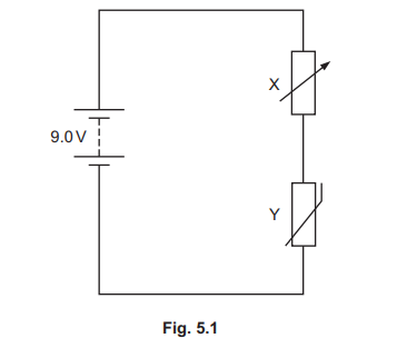 (b) A battery of electromotive force (e.m.f.) 9.0V and negligible internal resistance is connected in series with a variable resistor X and a thermistor Y as shown in Fig. 5.1.