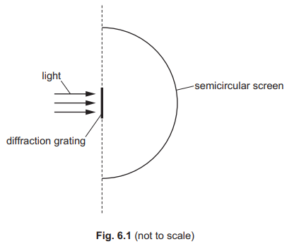 Light of a single frequency is incident normally on a diffraction grating. An interference pattern of bright and dark fringes forms on the semicircular screen shown in Fig. 6.1.