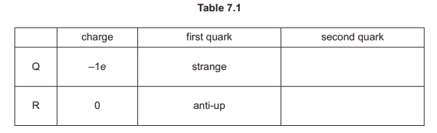 b) Q has a charge of –1e, where e is the elementary charge. R has a charge of 0. Complete Table 7.1 to show a possible second quark in each of Q and R.