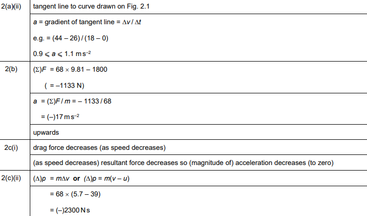 (b) The mass of the skydiver and her equipment is 68kg. The upthrust on the skydiver is negligible. After reaching terminal velocity, the skydiver opens her parachute at time \(t_1\). A total drag force of 1800N acts on the skydiver. Determine the magnitude and direction of the acceleration of the skydiver at time \(t_1\).