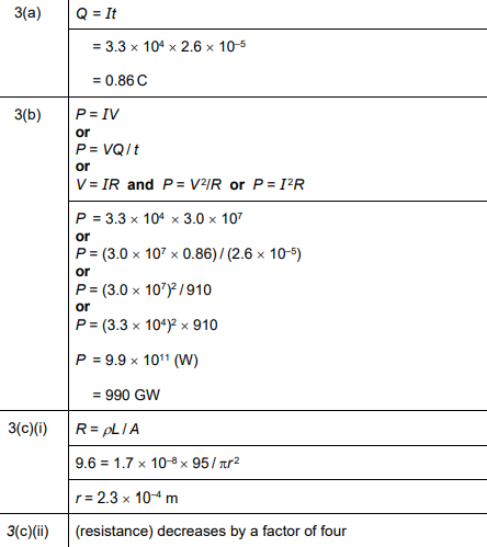 (i) The resistance of the lightning rod is 9.6Ω. The resistivity of copper is \(1.7 × 10^{–8}\)Ωm. Determine the radius of the lightning rod.
