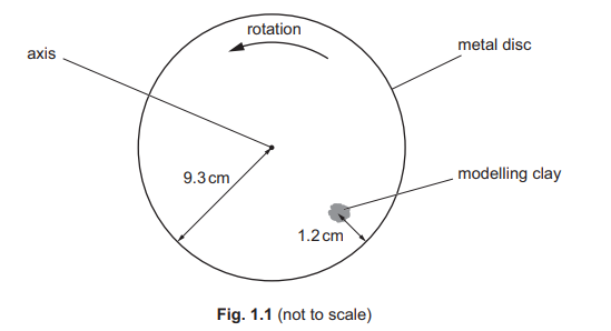 The centre of gravity of the modelling clay is 1.2cm from the rim of the disc and moves with a speed of \(0.68ms^{–1}\).