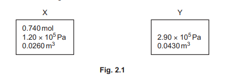 (b) Two cylinders X and Y each contain a sample of an ideal gas. The samples are in thermal equilibrium with each other. X has a volume of \(0.0260m^3\) and contains 0.740mol of gas at a pressure of \(1.20 × 10^5Pa\). Y has a volume of \(0.0430m^3\) and contains gas at a pressure of \(2.90 × 10^5Pa\). Data for the two cylinders are shown in Fig. 2.1.