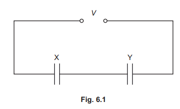 (a) Two capacitors X and Y are connected in series to a power supply of voltage V, as shown in Fig. 6.1.