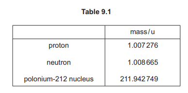 (b) Table 9.1 shows the masses of two sub-atomic particles and a polonium-212 (\(_{84}^{212}\textrm{Po}\)) nucleus.