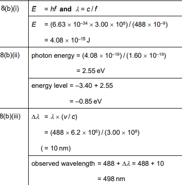 (a) (i) Explain how the positions of the lines in the emission spectrum seen by an observer on the Earth differ from the positions shown in Fig. 8.1.