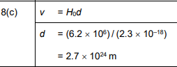 (c) A value for the Hubble constant is \(2.3 × 10^{–18} s^{–1}\). Determine the distance of the galaxy from the Earth.
