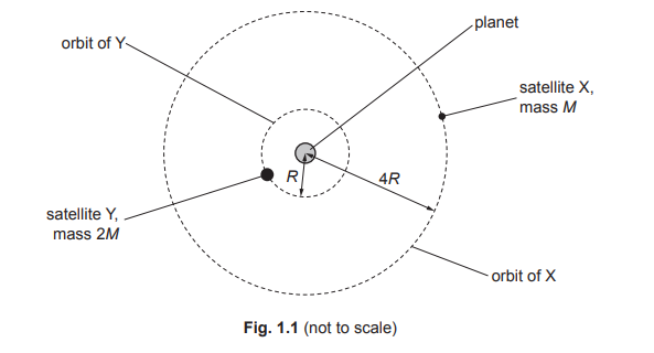 (b) A satellite X, of mass M, orbits a planet at a constant distance 4R from the centre of the planet, as shown in Fig. 1.1.