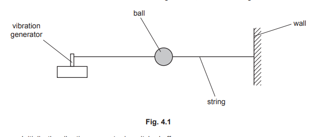 (b) A small ball is held in place using a stretched string. One end of the string is fixed to a wall and the other end is attached to a vibration generator, as shown in Fig. 4.1.