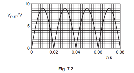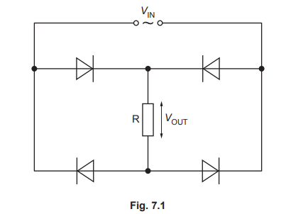 A circuit contains a power supply that provides a sinusoidal alternating input voltage \(V_{IN}\). There is an output voltage \(V_{OUT}\) across a load resistor R, as shown in Fig. 7.1.