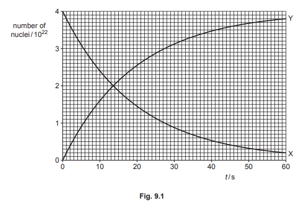 (b) Radioactive isotope X decays to isotope Y. A sample contains only nuclei of X at time t = 0. Fig. 9.1 shows the variation with t of the numbers of nuclei of X and of Y as the sample decays.