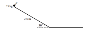 A slide in a playground descends at a constant angle of 30° for 2.5 m. It then has a horizontal section in the same vertical plane as the sloping section. A child of mass 35 kg, modelled as a particle \( P \), starts from rest at the top of the slide and slides straight down the sloping section. She then continues along the horizontal section until she comes to rest (see diagram). There is no instantaneous change in speed when the child goes from the sloping section to the horizontal section.