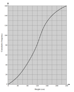 The heights in cm of 160 sunflower plants were measured. The results are summarised on a cumulative frequency curve.