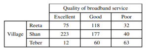 In the region of Arka, the total number of households in the three villages Reeta, Shan and Teber is 800. Each of the households was asked about the quality of their broadband service. Their responses are summarised in the following table.