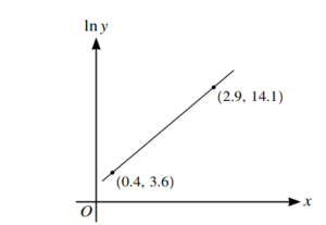 The variables $x$ and $y$ satisfy the equation $y = Ae^{(A-B)x}$, where $A$ and $B$ are constants. The graph of $\ln y$ against $x$ is a straight line passing through the points $(0.4, 3.6)$ and $(2.9, 14.1)$, as shown in the diagram.