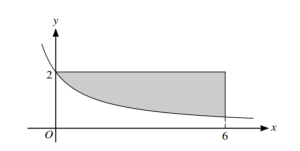 The diagram shows part of the curve $y = \frac{6}{2x+3}$. The shaded region is bounded by the curve and the