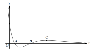The diagram shows the curve with equation $y = e^{-\frac{1}{2}x}(x^{2} – 5x + 4)$. The curve crosses the x-axis at the