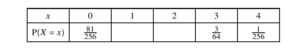 (c) $[E(X)] = [0 \times \frac{81}{256}] + 1 \times \frac{27}{64} + 2 \times \frac{27}{128} + 3 \times \frac{12}{256} + 4 \times \frac{1}{256} = 1$