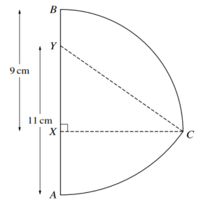 In the diagram, \( X \) and \( Y \) are points on the line \( AB \) such that \( BX = 9 \) cm and \( AY = 11 \) cm. Arc \( BC \) is part of a circle with center \( X \) and radius 9 cm, where \( CX \) is perpendicular to \( AB \). Arc \( AC \) is part of a circle with center \( Y \) and radius 11 cm.