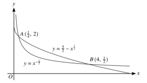 The diagram shows the curves with equations \( y = x^{-\frac{1}{2}} \) and \( y = \frac{5}{2} – x^{\frac{1}{2}} \). The curves intersect at the points \( A\left(\frac{1}{4}, 2\right) \) and \( B\left(4, \frac{1}{2}\right) \).