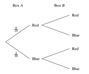 – From Box A: Red (\( \frac{6}{10} \)) and Blue (\( \frac{4}{10} \)).