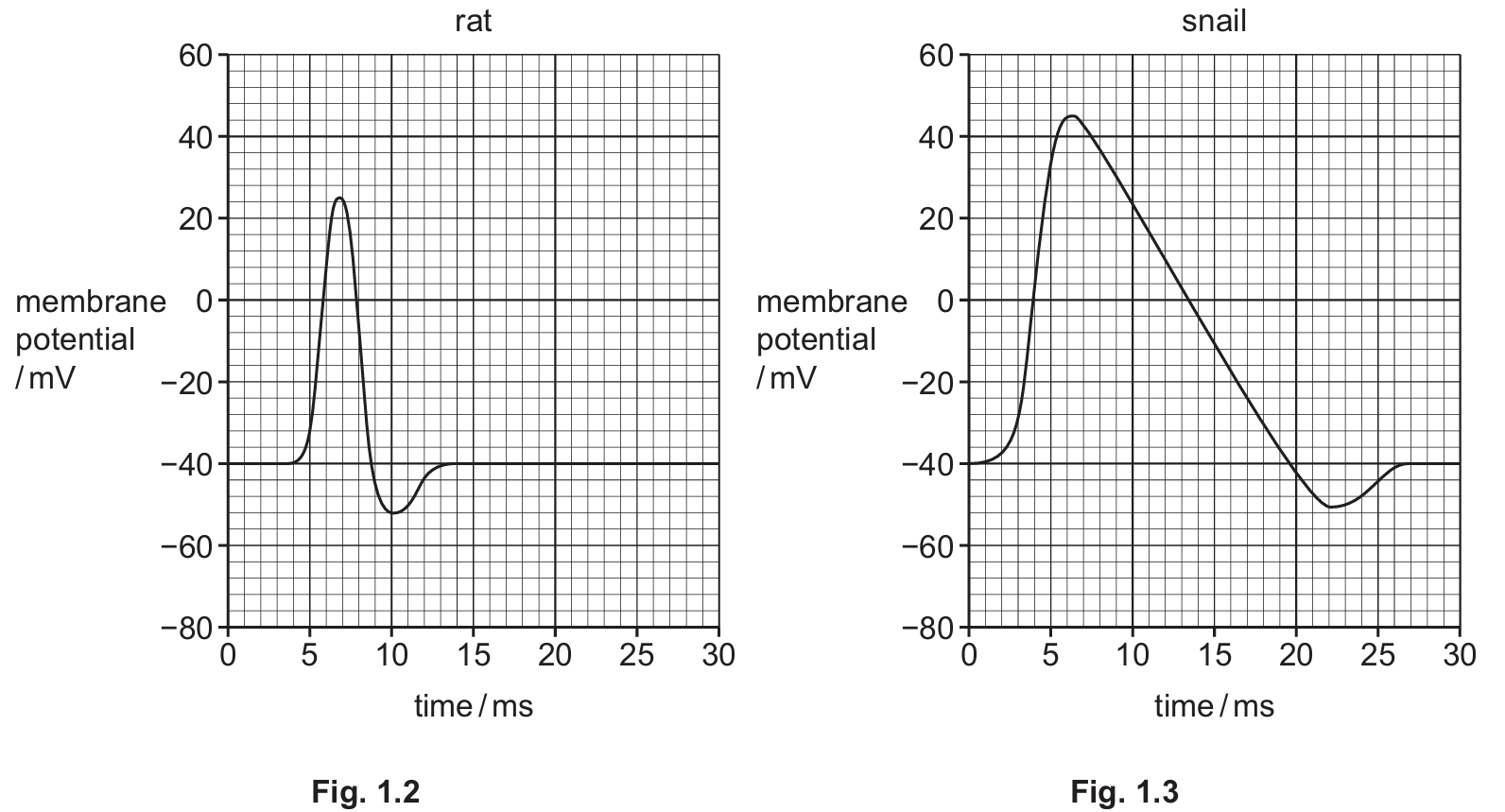 (b) Fig. 1.2 shows an action potential in a rat neurone and Fig. 1.3 shows an action potential in a snail neurone.