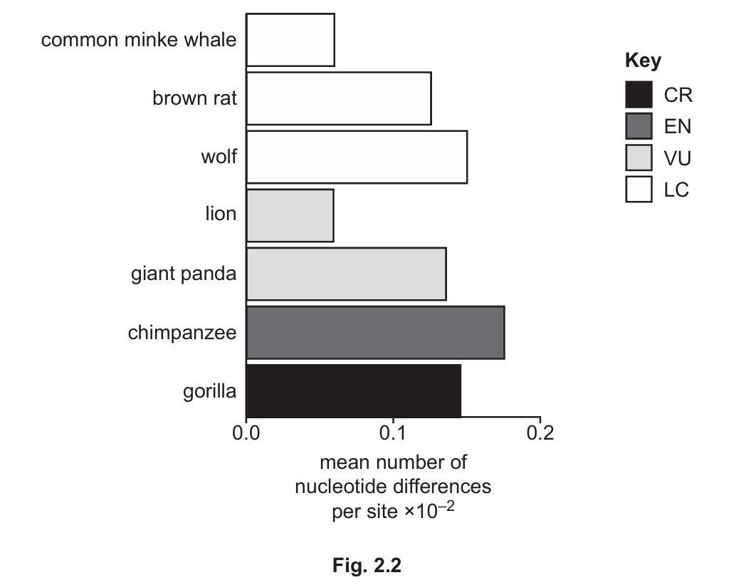 (iii) Fig. 2.2 shows the mean number of nucleotide differences per site of some species and sub-species of mammal and their conservation status.