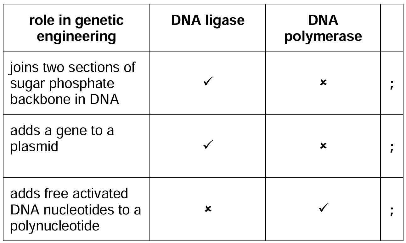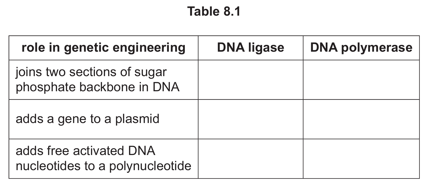 Complete Table 8.1 to show the roles of DNA ligase and DNA polymerase in genetic engineering.