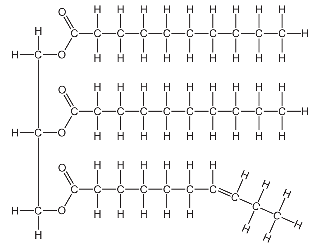 Triglycerides hydrolyze into 1 glycerol and 3 fatty acids. The diagram shows 2 saturated (no double bonds) and 1 unsaturated (with double bond) fatty acids. Glycogen (A/C) is incorrect as it’s a carbohydrate, not a lipid breakdown product.