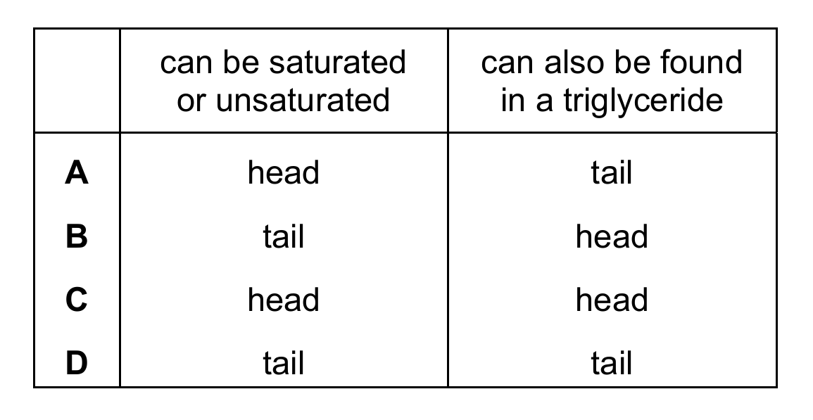 In phospholipids, the tails (fatty acid chains) can be saturated or unsaturated, and these same tails are found in triglycerides. The head group is always polar and identical in phospholipids, not variable like the tails. Therefore, the correct answer is D.