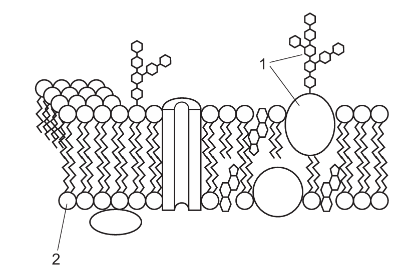 In the cell membrane, glycoproteins (1) are proteins with carbohydrate chains attached, extending from the surface. The phosphate heads (2) of phospholipids form the outer layer of the membrane bilayer. Glycolipids (D) would have lipid tails, and lipoprotein (B) isn’t a standard membrane component. Thus, C is correct.