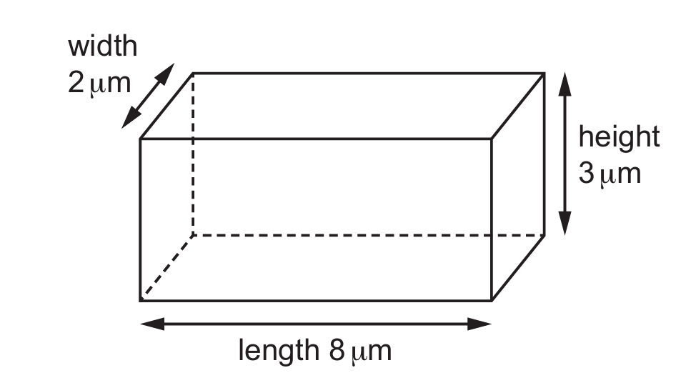 Surface area = 2(2×3 + 2×8 + 3×8) = 92 µm². Volume = 2×3×8 = 48 µm³. Ratio = 92:48 ≈ 23:12. When width doubles (4 µm), new ratio = 136:96 ≈ 17:12, which is smaller. Thus, C (23:12, decreases) is correct.