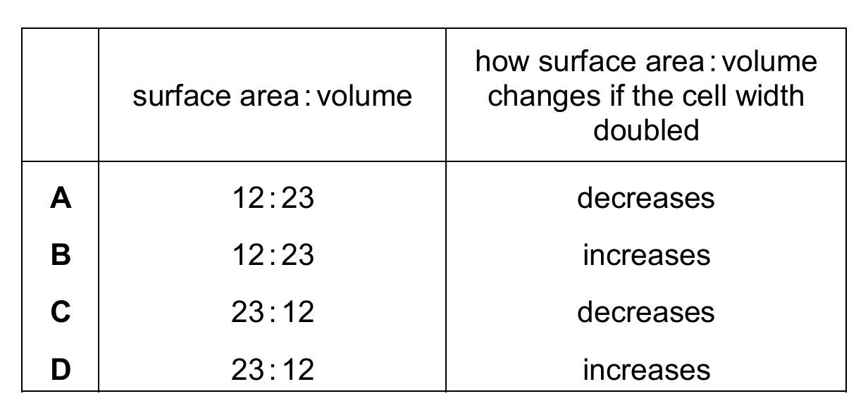 Which row shows the surface area to volume ratio of the epithelial cell and how the surface area to volume ratio of the cell would change if the cell width doubled?