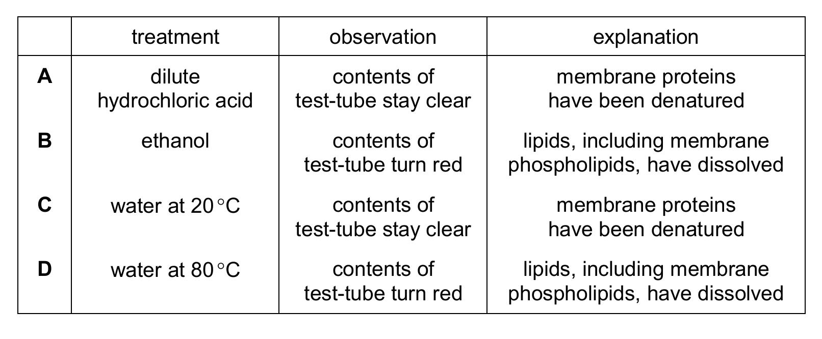 An investigation was carried out into the effect of four different treatments on the permeability of the cell surface membranes and tonoplasts of beetroot cells. Beetroot cell vacuoles contain a red pigment. This pigment cannot diffuse through the tonoplasts or cell surface membranes.